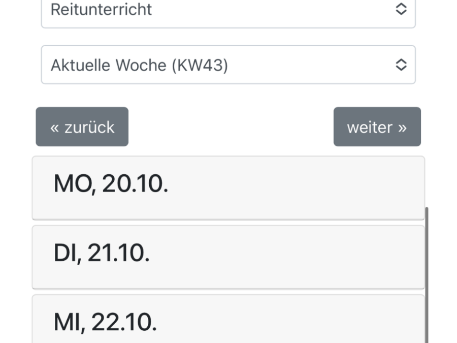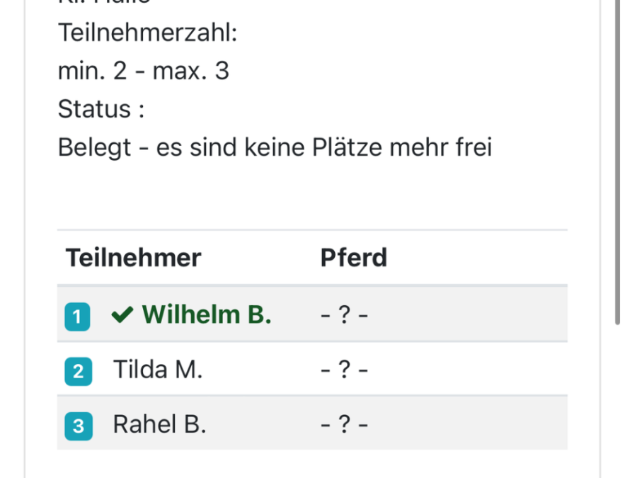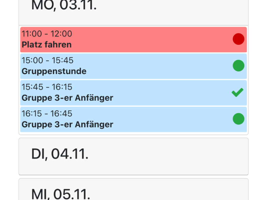 Jeder Reitschüler mit einem monatlich gebuchten Reit- oder Voltigierstunden-Abo kann von Zuhause aus einsehen, wann seine Reitstunde stattfindet. Zudem kann er im Falle einer Reitstunde auch schon vorab das von den Reitlehrern zugeteilte Pferd einsehen.