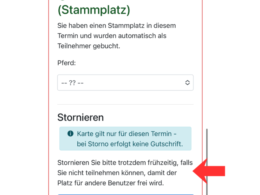 Sollte das Mitglied einmal verhindert sein, bitten wir darum, den Unterricht vorab zu stornieren. Dies verbessert die Planung der Reitlehrer. Hierzu scrollen Sie in der Teilnehmeransicht Ihrer gebuchten Stunde herunter bis zur Option "Stornieren". Achtung: Ein Storno ist gemäß des Abo-Vertrags immer kostenpflichtig.